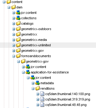 For Ex: If we upload a thumbnail image to a form then DAM stores its rendition on /content/dam/formsanddocuments/<Project>/renditions as shown in below figure.
