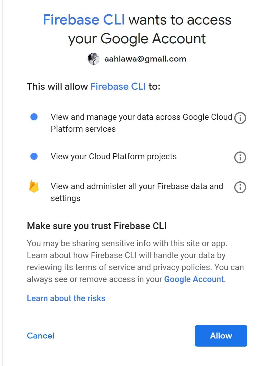 [Note: Firebase uses google login so if you have multiple accounts, use the right one (use the one used for creating your firebase project). Manage preference in web browser accordingly to complete login] - Click Allow.