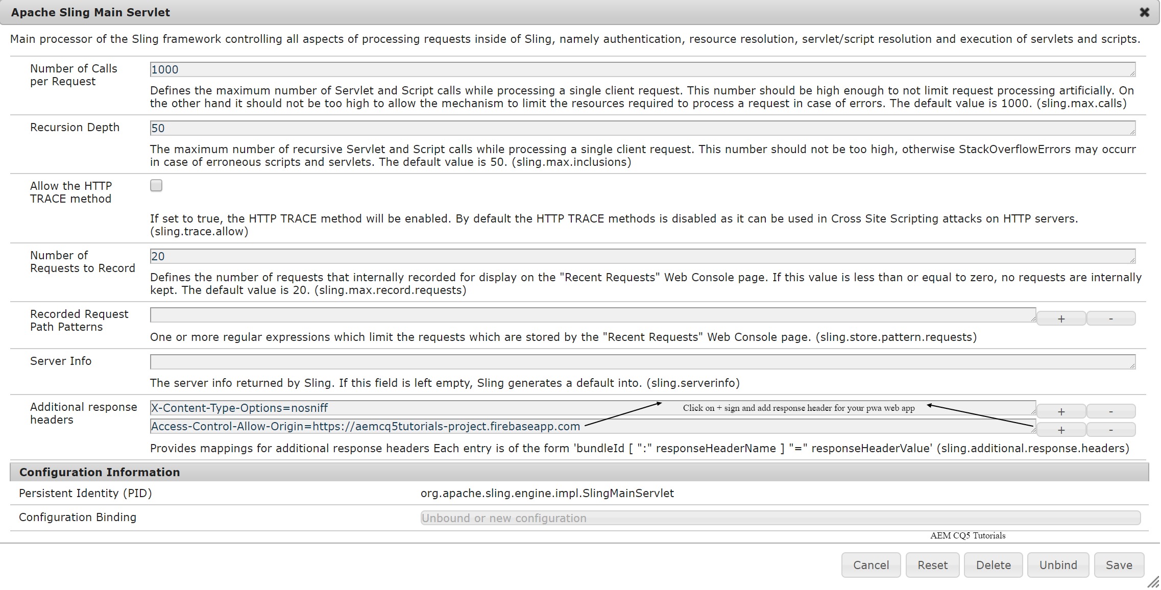 - Now search for Apache Sling Main Servlet and add additional response headers to it as shown below.