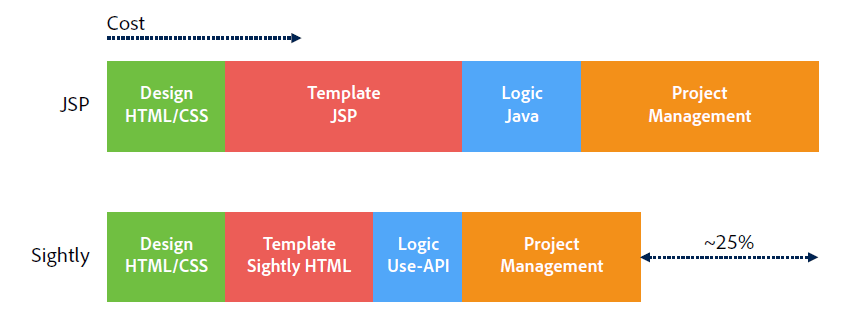As we have seen above using sightly component development becomes a part of web developer instead of java developer. It reduces development time and cost for template designing a lot as you can see in below diagram.
